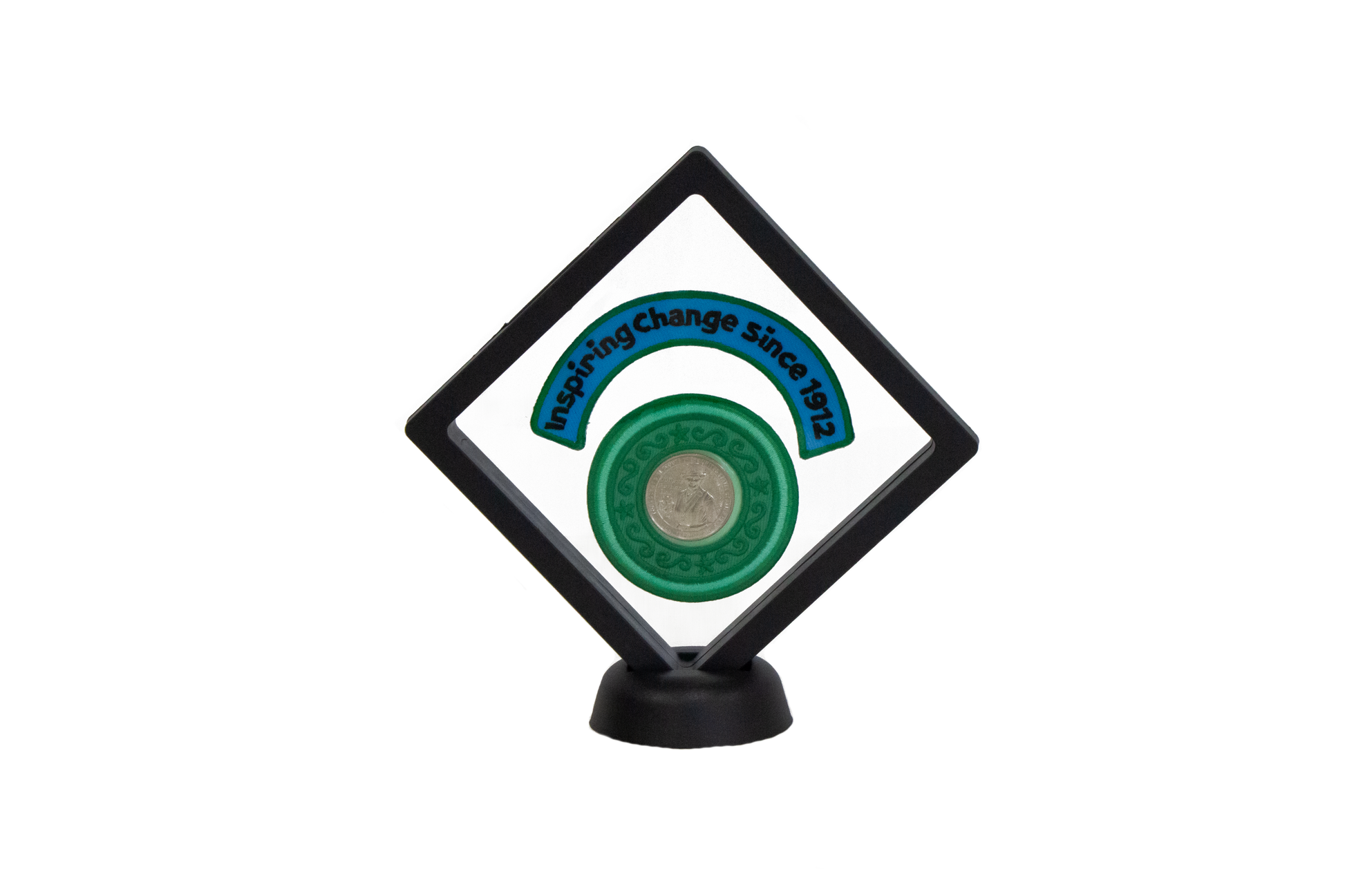 Celebrate the legacy of Girl Scouts with this one-of-a-kind functional patch and quarter, conveniently displayed to show off your Girl Scout Pride. Designed to hold a real U.S. quarter from the new commemorative coin series honoring our founder.